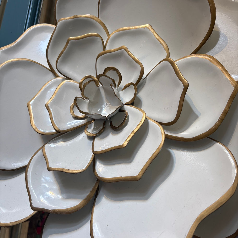 Flower, 16”, white and gold painted metal wall art